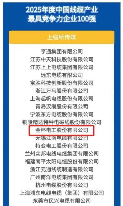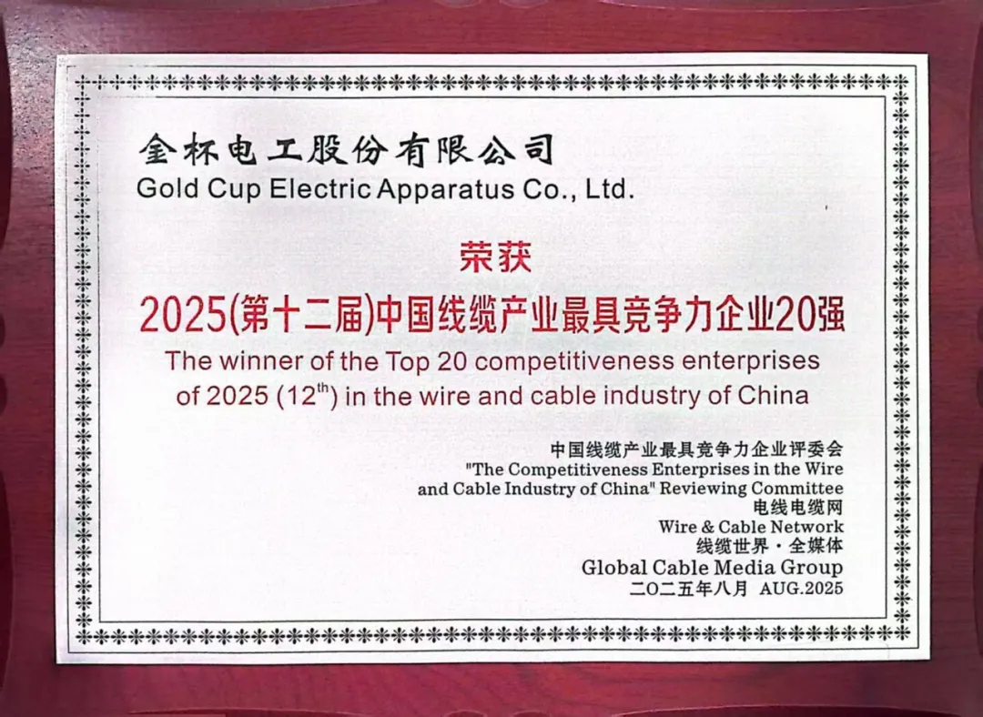 金杯電工榮獲“2025(第十二屆)中國線纜產(chǎn)業(yè)最具競爭力企業(yè)20強”第11位